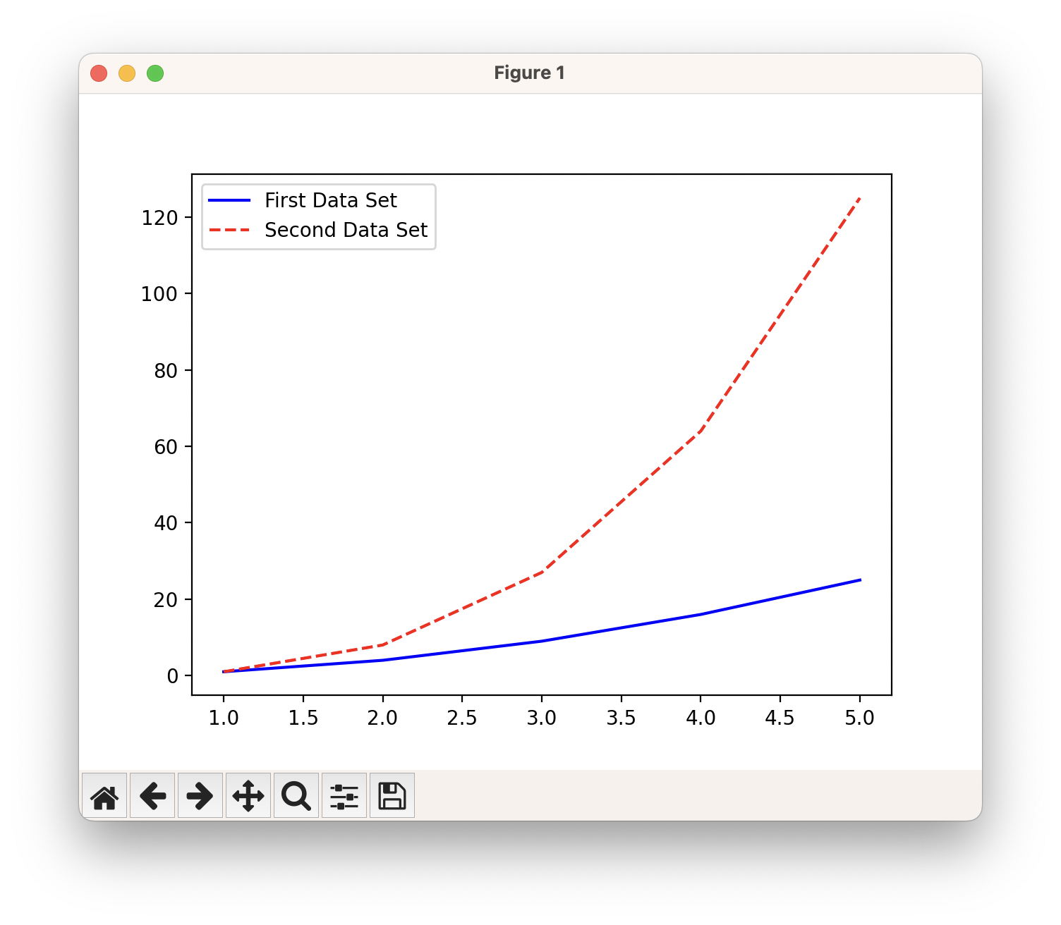 플롯에 범례를 추가하려면 plt.legend() 함수를 사용해야 하며, 이 함수는 표시한 데이터 집합에 해당하는 레이블 목록을 가져온다. 예를 들어 색상과 스타일이 다른 두 데이터 집합의 플롯에 범례를 추가하려면 다음과 같이 할 수 있다.