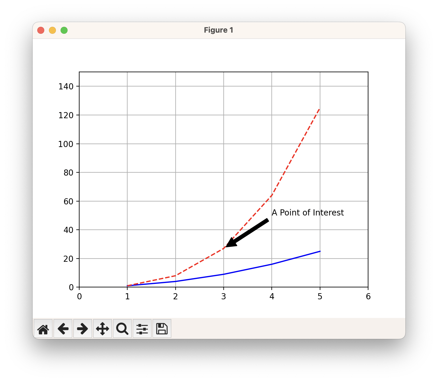 plt.annotate("A Point of Interest", xy=(3, 27), xytext=(4, 50), arrowprops=dict(facecolor='black', shrink=0.05))