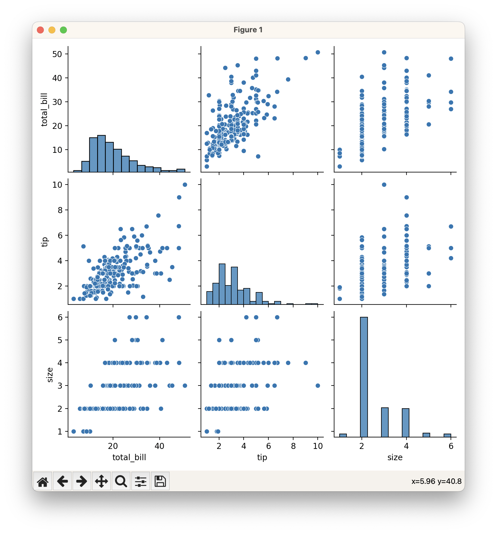 Seaborn으로 플롯을 만들려면 다양한 타입의 데이터와 통계량을 표시할 수 있는 sns 함수와 방법을 사용해야 한다. 예를 들어, 여러 변수 간의 쌍 관계에 대한 쌍 플롯을 작성하려면 sns.pairplot() 함수를 사용하여 표시할 데이터를 지정하는 하나 이상의 인수를 사용한다. 예를 들어, 레스토랑에서 고객이 제공하는 팁에 대한 정보를 포함하는 Seaborn에 내장된 데이터 집합인 팁 데이터 집합의 쌍 플롯을 작성하려면 다음 코드를 사용한다.