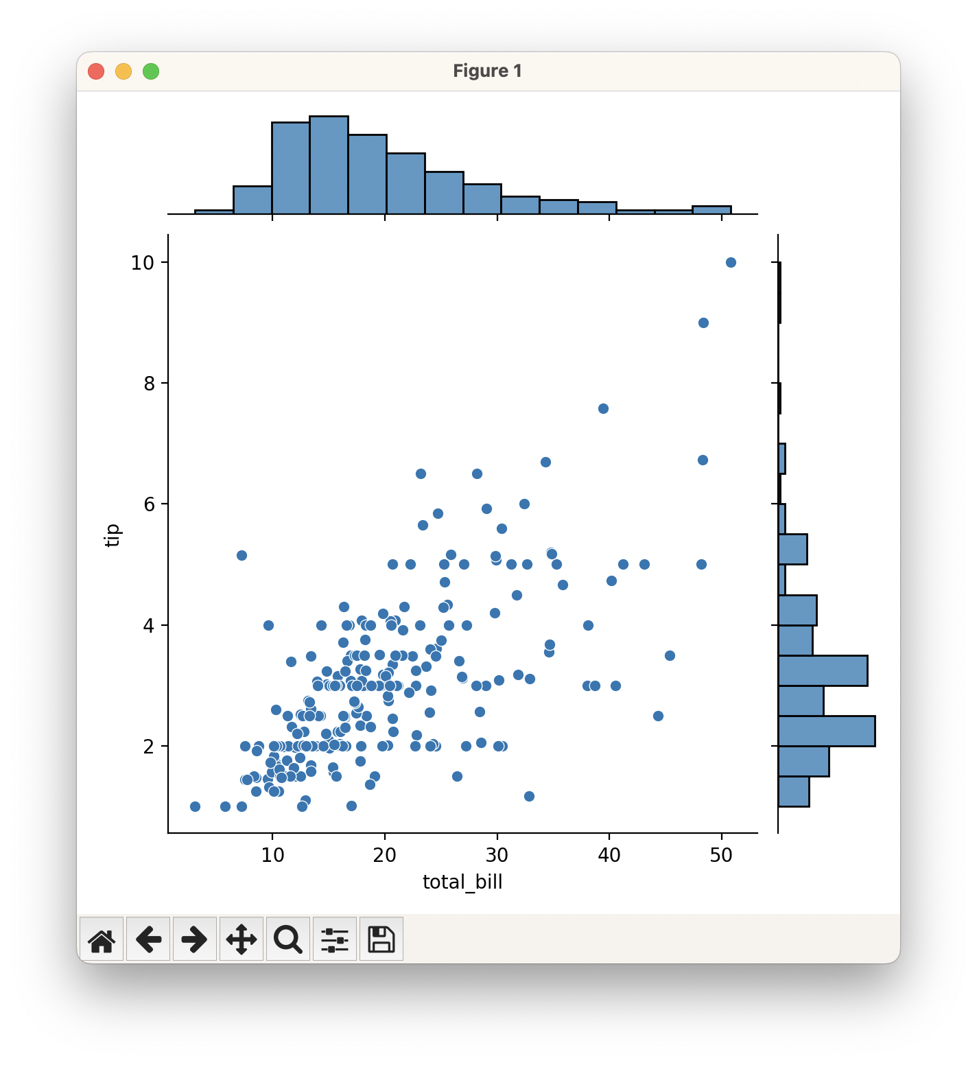 - 합동 플롯(joint plot): 합동 플롯은 두 변수 사이의 관계를 주변 히스토그램이 있는 산점도로 표시하여 보여준다. 합동 도표는 데이터의 합동 및 주변 분포를 보여주는 데 유용하다.