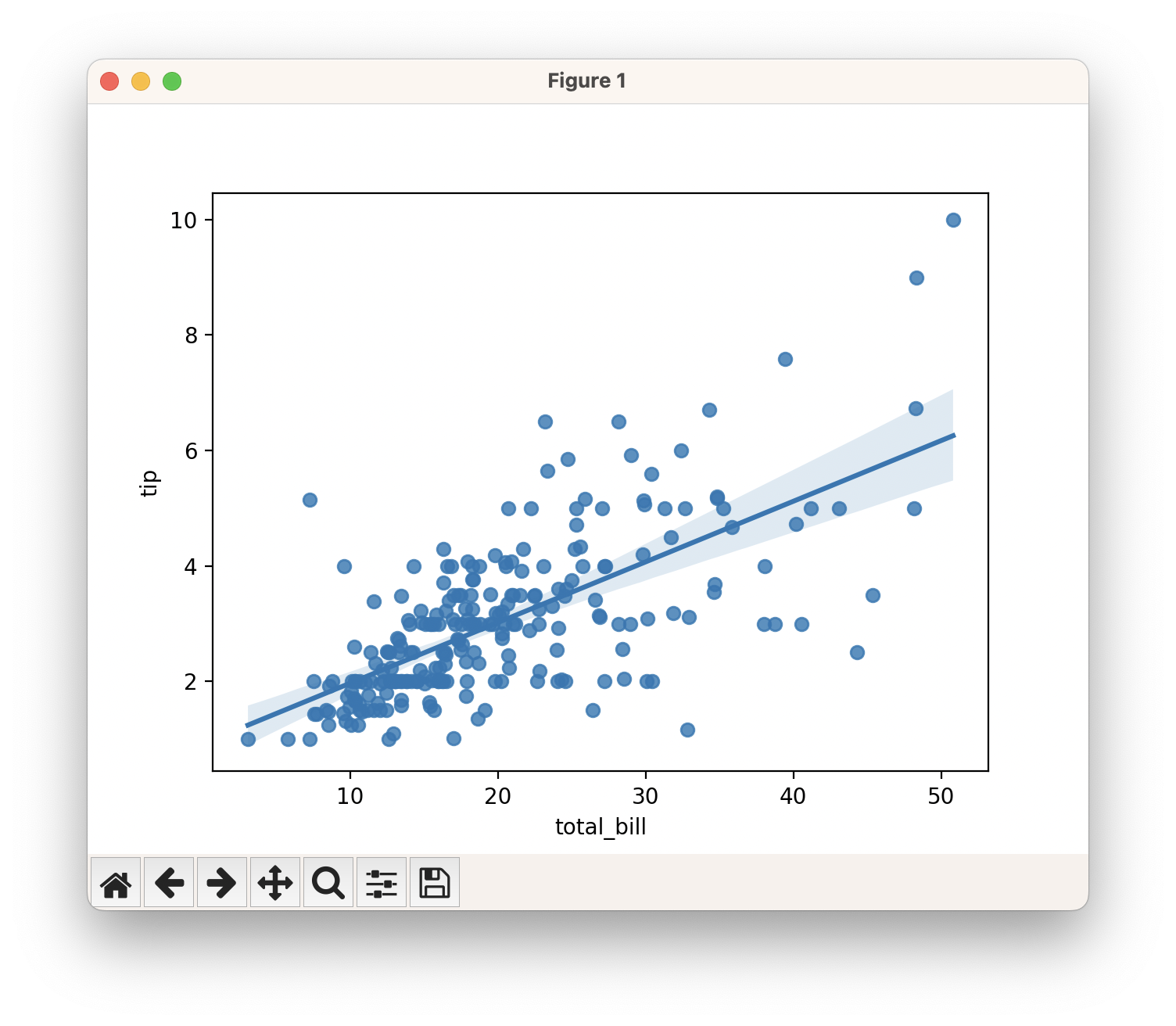 두 변수 간의 관계에 대한 회귀 그래프를 작성하려면 sns.regplot() 함수를 사용하고 sns.jointplot() 함수와 동일한 인수를 사용한다. 예를 들어 전체 청구서와 팁의 회귀 그래프 작성하려면 다음 코드를 사용할 수 있다.
