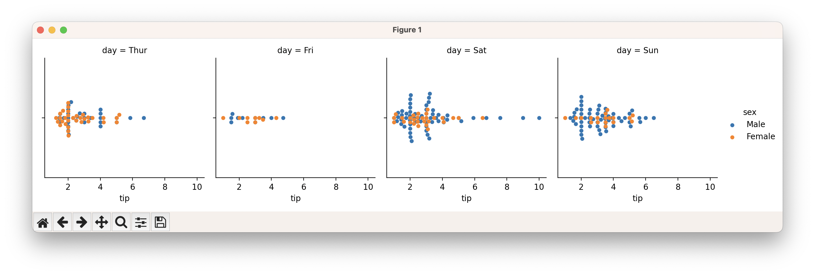 보다시피 sns.swarmplot() 함수를 사용하면 수치 변수의 개별 관측치의 군집 플롯을 만들 수 있다. 이 함수에 추가 인수를 전달하여 플롯의 방향, 색상 및 스타일을 변경할 수도 있다. 가능한 인수의 전체 목록은 Seaborn 문서에서 찾을 수 있다.