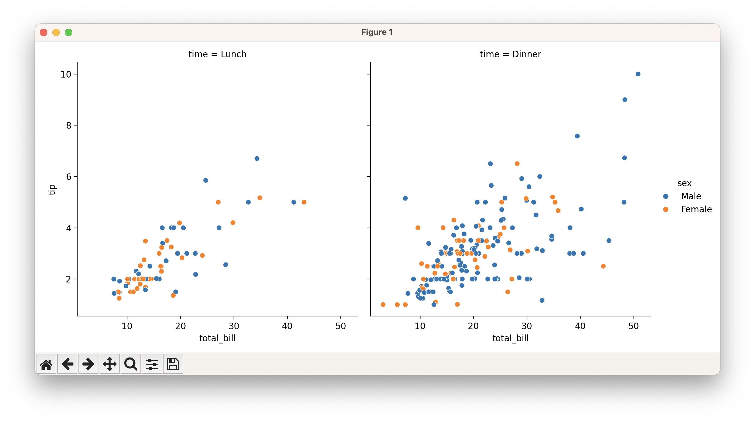 다른 측면과 수준을 사용하여 두 변수 간의 관계에 대한 관계도를 작성하려면 sns.relplot() 함수를 사용한다. 예를 들어 고객의 성별에 따라 다른 색상을 사용하고 하루 중 다른 시간에 대해 다른 열을 사용하여 전체 청구서와 팁의 관계도를 작성하려면 다음 코드를 사용한다.